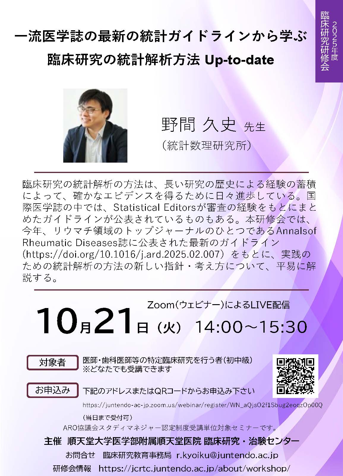 臨床研究研修会「一流医学誌の最新の統計ガイドラインから学ぶ臨床研究の統計解析方法 Up-to-date」を開催します ※オンライン(2025年10月21日)