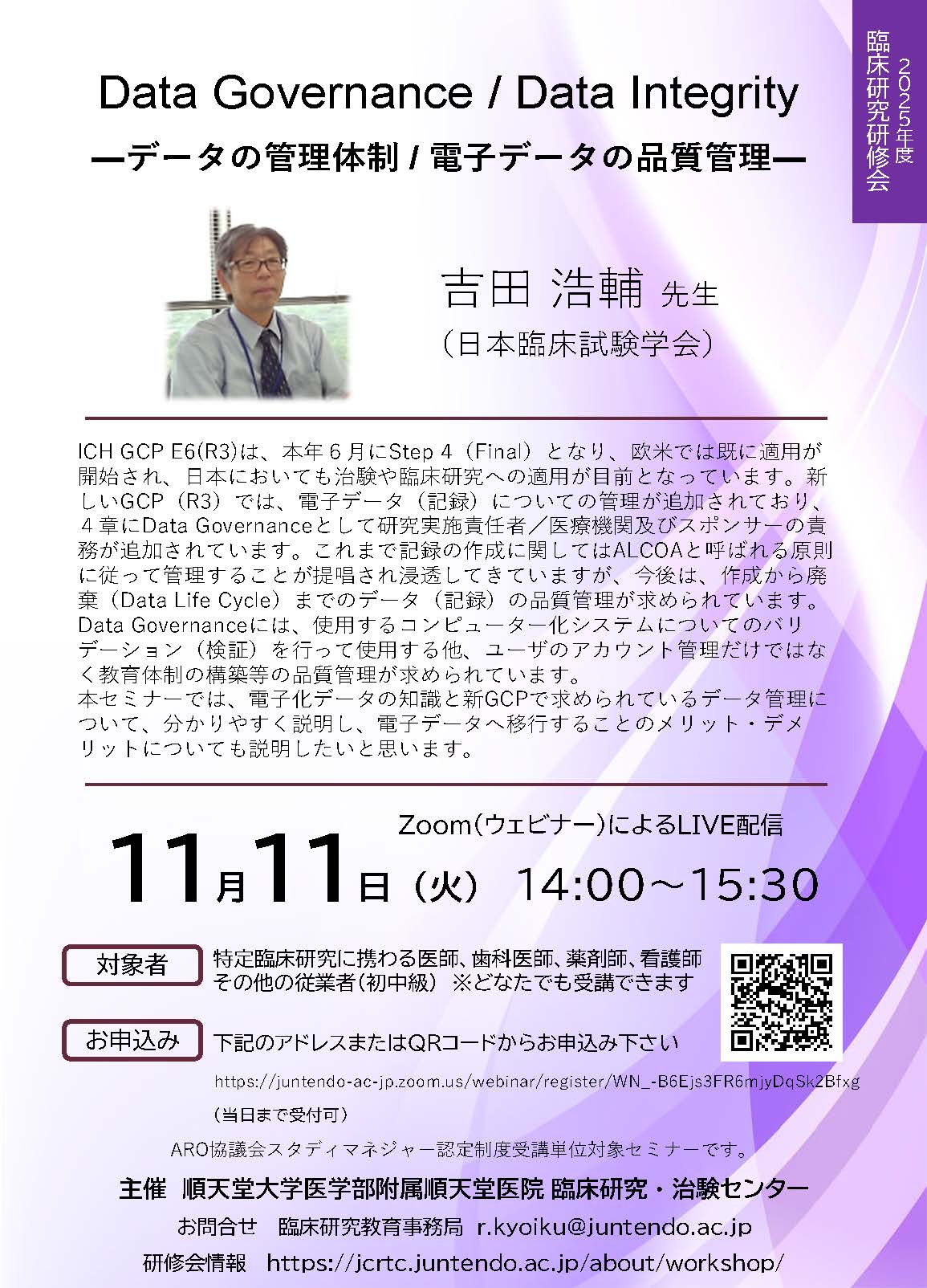 臨床研究研修会「Data Governance / Data Integrity ―データの管理体制 / 電子データの品質管理―」を開催します ※オンライン(2025年11月11日)