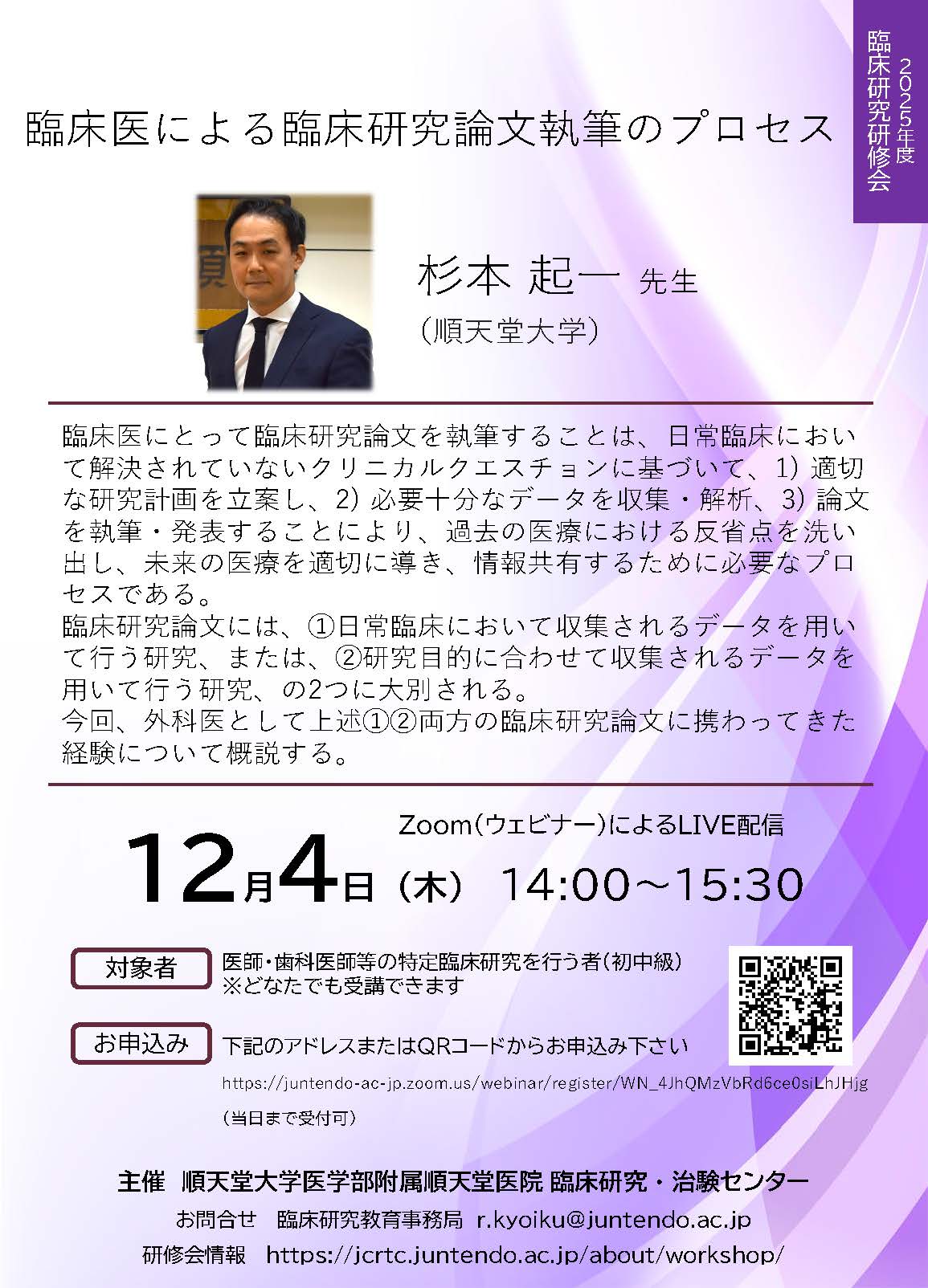 臨床研究研修会「臨床医による臨床研究論文執筆のプロセス」を開催します ※オンライン(2025年12月4日)